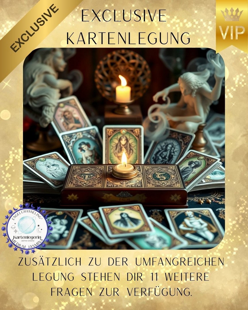 Die exklusive Legung umfasst: Zwei vollständig nacheinander ausgelegte Kartendecks (Skatkarten und Zigeunerkarten). Am Ende haben Sie die Möglichkeit, zusätzlich 11 weitere Fragen zu stellen. Diese 11 Fragen werden mit kurzen Antworten beantwortet, das heißt, Sie erhalten Ja/Nein/Vielleicht plus ein oder zwei erläuternde Sätze. Zudem bekommen Sie auch Botschaften aus dem Engel-Tarot.
