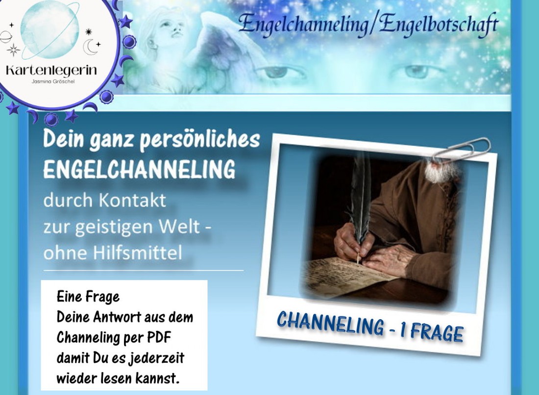 Ich werde für Sie ein Engelchanneling machen. Hierfür können Sie in diesem Angebot EINE Frage stellen. Die Antworten sind meist zwischen einer halben und einer dreiviertel DIN4 Seite lang (nicht handschriftlich).