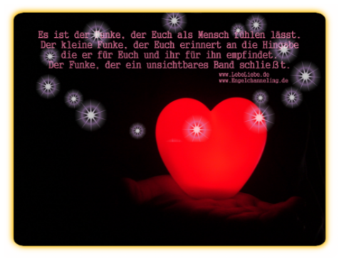 Er ist der Funke, das spirituelle Gen, das Euch als Mensch fühlen lässt. Der kleine Funken, der euch erinnert an die Hingabe die er für Euch und ihr für ihn empfindet. Der Funke, der ein unsichtbares Band schließt. Nie seid ihr allein. Er ist die höhere Macht, das liebevolle Wesen, welches Euch schützend umhüllt.