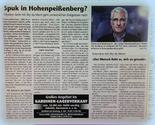 Passend zur Ausstrahlung auf TLC veröffentlichte der Kreisbote einen ausführlichen Bericht über mein mediale Erlebnis. Darin wird die Zusammenarbeit mit dem Team von Sky du Mont und die Untersuchung der paranormalen Ereignisse beleuchtet. Dieser Zeitungsartikel belegt meine fachliche Expertise und die regionale Anerkennung meiner medialen Arbeit.