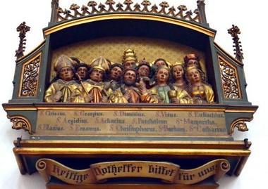 Es heißt wer in größter Not einen oder alle der Vierzehn Nothelfer anruft, dem soll auf wundersame Weise Hilfe zuteil werden.